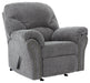 Why sacrifice comfort for style (or style for comfort) when you can have the best of both in this rocker recliner in pewter gray. Elements include a chic divided-back design and pillow top wrapped armrests that make nodding off all too easy. Calling attention to the elegantly flared armrests—black nickel nailhead trim for a punch of cool character.