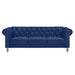 The New Classic Emma Chesterfield Velvet 3 Seat Sofa is a blend of soft elegance and sophisticated design. Crafted from 100% polyester velvet fabric, it offers cozy and indulgent seating for three. The glam tailoring features tufted backs and arms adorned with glimmering crystal buttons, adding a touch of luxury without compromising comfort. Upscale accents, including silver nailhead trim on the rolled arms and silver turned bun feet, enhance the royal blue velvet fabric. Shipped unassembled for easy placement in any home, its lower profile height makes it small space-friendly, fitting well into smaller rooms while providing full-size seating. Enjoy supportive seating with full foam cushions that provide ample comfort. Add a little sparkle in your home with the Emma Sofa.
