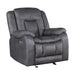 The Morello Glider Recliner in gray is designed to bring comfort and style to your living space. Upholstered in sumptuously soft 100% polyester fabric in a gray color, this recliner mimics the look of leather without the higher price tag. The Morello Glider Recliner features double-stitch detailing for added durability and a touch of sophistication. Plush, overstuffed arm, seat, and back cushions are contoured for enhanced comfort, ensuring a cozy seating experience. Enjoy the recliner's smooth gliding action that rocks you into relaxation, and take advantage of the fully upholstered chaise recliner footrest for ultimate comfort. Built with hardwood and manufactured wood frames, coil spring cushions wrapped in resilient foam and polyester, and no-sag seat suspension, this glider recliner promises years of enjoyment. The casual, transitional style, with its leather-look upholstery and overstuffed cushioning, creates a comfortable, lived-in ambiance, making the Morello Glider Recliner a perfect addition to any home.