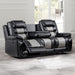 Elevate your relaxation experience with the Nikko Dual Recliner Sofa with Power Footrests, Hidden Cupholders, and Drop Down Snack Tray . This sofa, crafted with long-lasting construction using hardwood and plywood frames, offers stable and durable seating. Enjoy luxurious comfort with resilient foam cushions and pocket coil support, providing a cozy place to lounge. The two-tone black and gray fabric, made from 80% polyester and 20% PU, gives the soft touch and look of leather while being breathable. This sofa stands out with distinctive details like nailhead trim, diamond stitch pattern seats, double wrapped headrests, and expert tailoring. Practical lifestyle features include a center back cushion that conveniently drops down into a snack tray complete with beverage holders, and hidden pull-out cupholders discreetly housed under the armrests. Keep your devices powered up with USB charging ports. Plush pillowed arm and headrests, reclining backs, and comfortable footrests provide the ultimate place to unwind. Find your perfect recline position with a touch of the power button. Transform your living space with the Nikko Dual Recliner Sofa and enjoy unparalleled comfort and style in your home.
