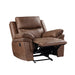 The Ryland Glider Recliner in Brown offers the perfect blend of durability, comfort, and style. Built with premium hardwood and plywood frames, this recliner ensures lasting stability and support. The resilient foam cushions, combined with advanced pocket coil technology, provide superior comfort that retains its shape over time. Wrapped in leatherlike 100% polyester fabric, the rich chestnut brown upholstery gives you the luxurious look of leather without the high maintenance. Detailed with thick contrast stitching and generously cushioned head and armrests, it adds a touch of sophistication to any room. Whether you're enjoying the soothing gliding motion or reclining effortlessly with the smooth-action, heavy-duty mechanism, the Ryland Glider Recliner delivers the perfect spot to relax and unwind in ultimate comfort.