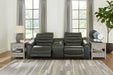 For those seeking to curate a living room retreat that offers superior comfort and a contemporary aesthetic, the sleekly designed Center Line power reclining seating package will become your favorite source of at-home serenity. Rest on combination leather/faux leather upholstery, and use the one-touch power controls to recline and adjust the headrests with ease. As you recharge after a long day, your devices can too with USB charging. This set is visually enticing in a luxe dark gray, with slope track arms and stitched detailing on the back to enhance its modern appeal.