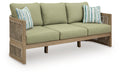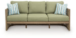 Round out your outdoor living space with the naturally beautiful look of wood. This cushioned sofa will serve up seasons of relaxation on your back deck or sitting pretty by the pool. The couch's gently curved, open-weave design is crafted from eucalyptus wood and polyester rope, for the perfect merger of high fashion and lasting durability. Plush cushions and accent pillows are wrapped in cleanable, UV-resistant Nuvella® fabric, making stylish living a breeze.