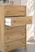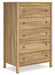 This chest of drawers puts the dream of a casual bedroom retreat beautifully within reach. A warm light brown finish over replicated hickory grain exudes a homey vibe. The smooth-gliding drawers are packed with storage possibilities. It’s a simply relaxed way to achieve the look you want to wake up to every morning.