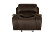 Unwind in style with the Brookings Glider Recliner in rustic brown. Upholstered in a leather-look polyester/pu fabric, this recliner offers the rich appearance of real leather at a fraction of the cost. Tailored to perfection with pillowed arms and double stitched racetrack arms, its bucket seats and plush backrests feature distinctive baseball contrast stitching for added flair. The fully upholstered chaise recliner footrest ensures ultimate comfort, while the hardwood and manufactured wood frames provide durable support. Rock yourself to relaxation with the smooth gliding action of this recliner, complemented by its casual yet transitional style that lends a comfortable, lived-in ambiance to any home.