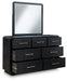 Details B821B5: Includes upholstered panel headboard, footboard and rails , Made with hardwood solids and ash veneer, Black finish on textured wood grain surface , Waterfall edges, Polyester upholstery, Foundation/box spring required, sold separately, Mattress available, sold separately, Assembly required, B821B1: Includes dresser and mirror, Made with hardwood solids and ash veneer, Black finish on textured wood grain surface , Burnished nickel-tone pulls, Waterfall edges, 7 smooth-gliding drawers with fully finished interior, dovetail construction and heavy duty ball-bearing side glides, Mirror attaches to back of dresser, B821-91: Made with hardwood solids and ash veneer, Black finish on textured wood grain surface, Brushed nickel-tone pulls, Waterfall edges, Smooth-gliding drawer with fully finished interior, dovetail construction and heavy duty ball-bearing side glides, Lower cubby shelf with built-in LED nightlight, 110V power supply with USB-A and USB-C charging ports, Power cord included; UL Listed,