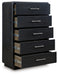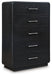 Details B821B5: Includes upholstered panel headboard, footboard and rails , Made with hardwood solids and ash veneer, Black finish on textured wood grain surface , Waterfall edges, Polyester upholstery, Foundation/box spring required, sold separately, Mattress available, sold separately, Assembly required, B821B1: Includes dresser and mirror, Made with hardwood solids and ash veneer, Black finish on textured wood grain surface , Burnished nickel-tone pulls, Waterfall edges, 7 smooth-gliding drawers with fully finished interior, dovetail construction and heavy duty ball-bearing side glides, Mirror attaches to back of dresser, B821-46: Made with hardwood solids and ash veneer, Black finish on textured wood grain surface, Burnished nickel-tone pulls, Waterfall edges, 5 smooth-gliding drawers with fully finished interior, dovetail construction and heavy duty ball-bearing side glides, B821-91: Made with hardwood solids and ash veneer, Black finish on textured wood grain surface, Brushed nickel-tone pulls, Waterfall edges, Smooth-gliding drawer with fully finished interior, dovetail construction and heavy duty ball-bearing side glides, Lower cubby shelf with built-in LED nightlight, 110V power supply with USB-A and USB-C charging ports, Power cord included; UL Listed,