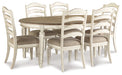 | Details | D743-35: Made of veneers, wood and engineered wood, Antiqued two-tone finish, Separate extension leaf, Table extends by pulling both ends and dropping in leaf, Seats up to 6, Assembly required, D743-01: Made with wood and engineered wood, Distressed, chipped white finish, Ladderback styling, Polyester upholstery over foam cushioned seat, Assembly required, | |