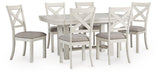 Details D642-01: Made with solid wood frame, Antiqued white finish with grain texture, Light gray polyester upholstery, Nailhead trim, X-back, Assembly required, D642-45: Made with rubberwood solids, ash veneer and MDF substrates, Antiqued white finish with grain texture, Tabletop with planked effect, Two 12" removable center leaves, Table extends to 86" overall by pulling both ends and dropping in leaves, Seats up to 8, Assembly required,