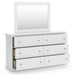 | Details | B139B42: Includes panel headboard/footboard and rails, Made with engineered wood (MDF/particleboard/plywood) and decorative laminate for the right balance of affordability and durability, Replicated solid white paint, Decorative laminate replicates natural or man-made material surfaces with consistent color, pattern and texture, Foundation/box spring required, sold separately, Mattress available, sold separately, Assembly required, B139B40: Includes dresser and mirror, Made of engineered wood (MDF/particleboard), Knobs with pewter-tone finish, Scalloped moulding, 6 smooth-operating drawers, Includes tipover restraint device, Mirror attaches to back of dresser; can also be mounted on wall horizontally or vertically, Safety is a top priority, clothing storage units are designed to meet the most current standard for stability, ASTM F 2057 (ASTM International), Drawers extend out to accommodate maximum access to drawer interior while maintaining safety, | |