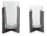 | Details | Set of 2, Made of clear glass with hammered effect, Metal base with antiqued pewter-tone finish, Each holds a 3” pillar candle (candles not included), Due to the finishing process of this product, some variations may occur | |