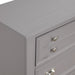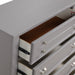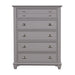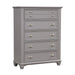 The Jamestown 5-Drawer Chest in Gray is a masterful blend of style, durability, and practicality, making it an essential addition to any bedroom. Expertly crafted from solid Acacia, premium manufactured woods, and authentic Oak veneers, this chest is built to endure, maintaining the natural elegance of real wood for years to come. The Jamestown collection exemplifies modern transitional style, merging contemporary and traditional design elements with a soft, brushed gray finish that exudes sophistication and versatility, effortlessly complementing a wide range of color palettes. This 5-drawer chest provides ample storage to keep your bedroom tidy and clutter-free. Thoughtfully designed with clean lines and elegant panel detailing, it combines practicality with refined style to enhance the room's overall ambiance. The drawers glide effortlessly on robust full-extension glides, with meticulous dovetail joinery inside, highlighting superior craftsmanship and ensuring smooth, reliable operation. Thoughtful details, such as finished drawer interiors to prevent snags and a velvet-lined top drawer, offer an extra layer of protection for your most treasured items, making this chest as functional as it is beautiful.
