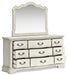 Details B980B4: Includes headboard, footboard and rails, Made with hardwood solids, spruce veneer, MDF substrates and cast resin components , Antiqued white painted finish, Polyester upholstery, Button tufting, Foundation/box spring required, sold separately, Mattress available, sold separately, Assembly required, B980B1: Includes dresser and mirror, Made with hardwood solids, spruce veneer, MDF substrates and cast resin components, Antiqued white painted finish, 9 drawers with fully finished interiors, French and English dovetail construction and ball-bearing side glides, Metal bar pulls with aged pewter-tone finish, Mirror attaches to back of dresser, B980-93: Made with hardwood solids, spruce veneer, MDF substrates and cast resin components, Antiqued white painted finish, 3 drawers with fully finished interiors, French and English dovetail construction and ball-bearing side glides, Metal bar pulls with aged pewter-tone finish, 110V power supply with dual USB charging ports, Power cord included; UL Listed,
