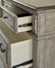 Details Includes dresser and mirror, Made with acacia wood, birch and acacia veneers, engineered wood and cast resin components, Two-tone finish; antiqued gray body with a rich, deep walnut brown finish on top, Dark bronze-tone bails and knobs, 7 smooth-gliding drawers with dovetail construction, Framed drawer fronts , Overlay decorative corbels, Mirror attaches to back of dresser, Assembly required