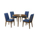 The Maggie 5 Piece Wood Dining Set is where expert craftsmanship meets contemporary elegance, providing a sophisticated yet practical dining solution. Built from a robust blend of solid Rubberwood, manufactured wood, and genuine Oak wood veneers, this set promises durability and timeless appeal. The rich walnut brown finish, meticulously applied through a multi-step process, accentuates the natural grain patterns of the wood, making each piece uniquely beautiful. This set features a 47" round dining table that offers an inviting space perfect for intimate meals, comfortably seating four guests. The four Parsons-style chairs, upholstered in luxurious blue polyester, provide plush comfort and a modern aesthetic, making every dining experience relaxing and stylish. With its sleek lines and fresh transitional design, the Maggie dining set is an effortlessly elegant centerpiece that enhances any dining room, offering both style and comfort—an ideal addition to your home.