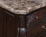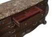 The Royal Classics Palazzo Marina 9 Drawer Dresser is a perfect blend of timeless elegance, superior craftsmanship, and modern functionality. Expertly constructed from solid Poplar and Cherry veneers, this dresser boasts a rich walnut finish that accentuates the wood’s deep, natural grain. The meticulously carved details, burnished with gold tipping, and the collection’s signature circular motif give this piece an air of distinction and refinement. The dresser’s luxurious marble top, featuring a rich brown base with flowing cream and beige veining, adds dynamic depth and sophistication to its design. Built for durability, the dresser features English dovetail joinery and full-extension drawers for effortless access and snag-free storage. The top drawers are velvet-lined for delicate items, while the cedar-lined bottom drawers protect your belongings and offer generous storage space. With a seamless blend of traditional style and modern conveniences, this dresser is a practical yet elegant addition to any bedroom.