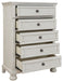 Elegant, timeless furnishings take your bedroom to the next level. Nothing does that better than this chest of drawers. The antiqued white finish with a wonderful grain texture radiates sophistication, while dark bronze-tone knobs add an ornate touch. Felt finishing in the upper drawers rounds out this tasteful piece.