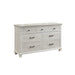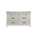 The Silver Sands Dresser combines durability and quality construction, crafted from solid pine, manufactured woods, and oak wood veneers for a strong and stable piece. Its transitional style merges clean, simple lines with a rustic wood finish, creating a calm and inviting atmosphere. The misty gray finish, achieved through a meticulous multi-step, hand-applied process, offers a light, weathered look that highlights the natural grain and mineral patterns of the wood. Elegant design features, including a raised base, full return and dentil moldings, and contrasting hardware, add a sophisticated touch. Heirloom-quality drawers with dovetail joinery and three-stage steel ball glides ensure smooth, full-extension operation and can support heavy loads. With seven spacious drawers, including velvet-lined top drawers to protect delicates, this dresser provides ample storage for clothing essentials. Combining style, durability, and functionality, this dresser is a practical and elegant addition to any bedroom.