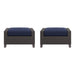The Skye Outdoor Ottoman Set in rich Navy Blue includes 2 cushioned ottomans and is crafted with durable aluminum frames and a baked-on powder finish to ensure longevity and scratch resistance. The high-density HDPE wicker mimics the look of natural wicker while being low maintenance and weather resistant. 6 1/2" thick seat cushions made of high-density foam, upholstered in our exclusive SUNDURA® Olefin fabrics provide a comfortable footrest or additional seating. . These fabrics are not only breathable but also resistant to water, stains, mold, and mildew, ensuring your furniture stays pristine year-round