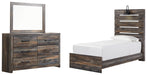 Details B211B1: Made of engineered wood (MDF/particleboard) and decorative laminate, Brown rustic finish with burnt orange and teal accents in a replicated wood grain with authentic touch, 6 smooth-gliding drawers, Drawers lined with faux linen laminate, Dark-tone industrial hardware, Mirror attaches to back of dresser, Assembly required, Includes tipover restraint device, B211B2: Includes headboard, footboard and rails, Made of engineered wood (MDF/particleboard) and decorative laminate, Brown rustic finish with burnt orange and teal accents in a replicated wood grain with authentic touch, Decorative sconce LED light, runs on 3AA batteries, 2 USB charging ports, Power cord included; UL-listed, Mattress and foundation/box spring available, sold separately, Assembly required, Bed is compatible with an adjustable base,